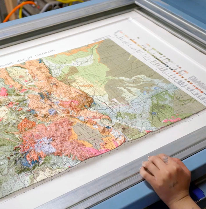 Explore the topography of Ireland on the 1962 Geological Map of the country in stunning 3D Raised Relief, an original creation from Muir Way. This unique map undergoes a meticulous process where it is printed, heated, and vacuum-formed over an intricately detailed 3D mold. The result is a map that allows you to visually and tactically explore the country's diverse terrain, from the low central plains to the coastal mountains.