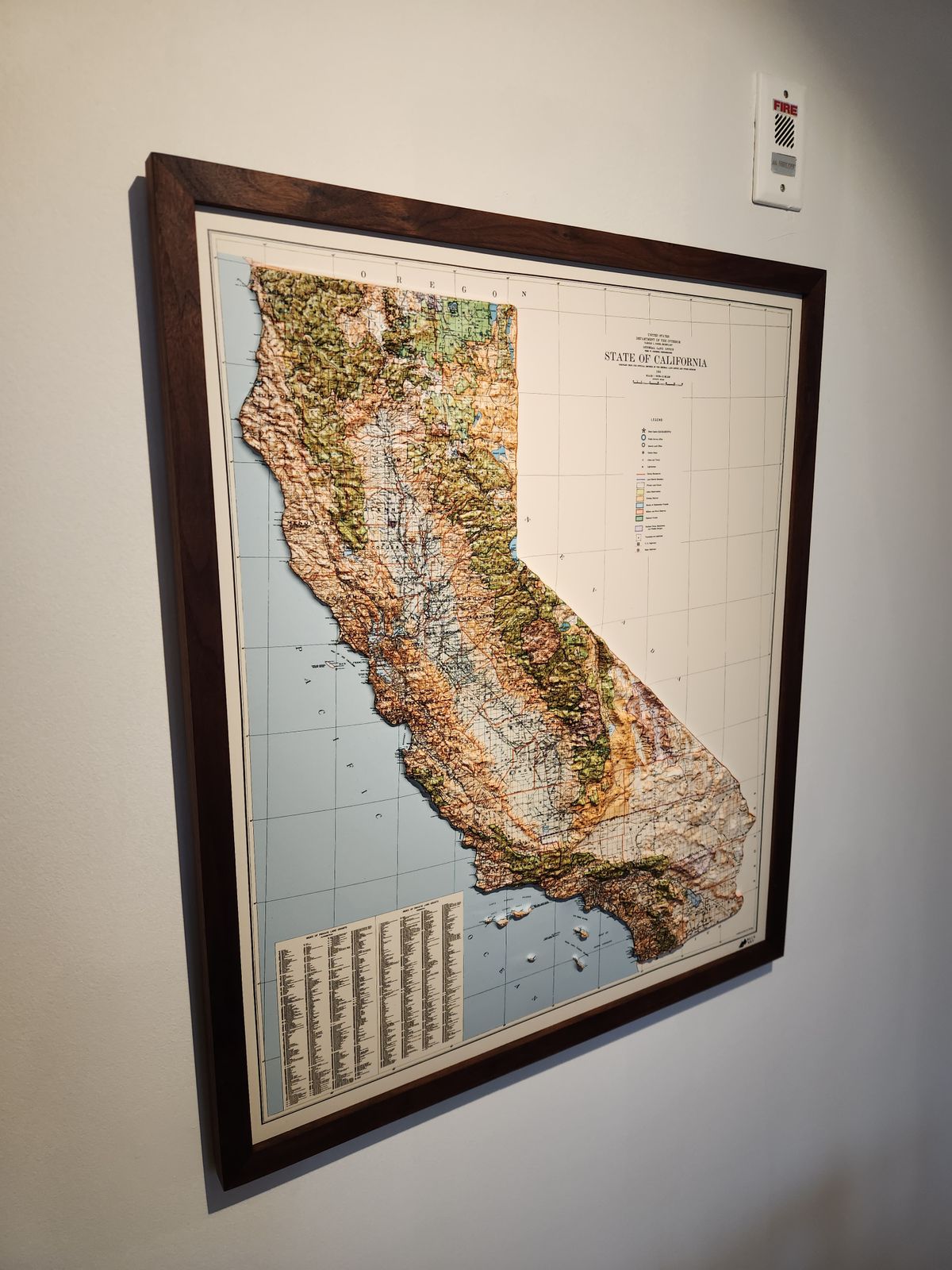 Explore the topography of California on the 1944 Topographical Map of the state in stunning 3D Raised Relief, an original creation from Muir Way. This unique map undergoes a meticulous process where it is printed, heated, and vacuum-formed over an intricately detailed 3D mold. The result is a map that allows you to visually and tactically explore the diverse terrain of the state, from the Sierra Mountains to the Channel Islands.