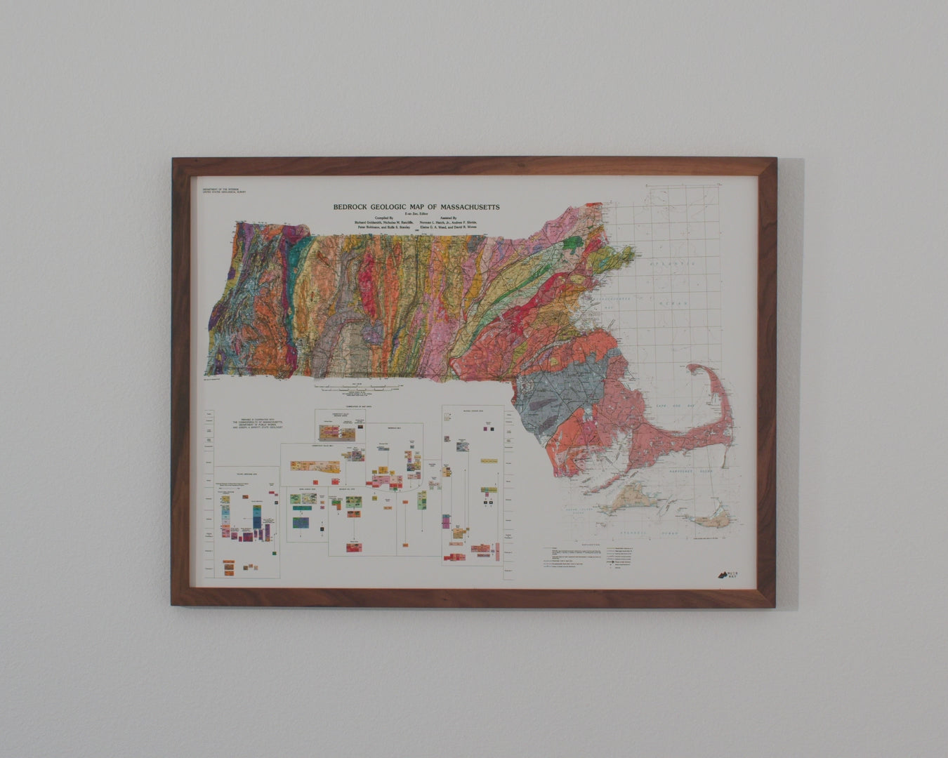 Explore the topography of the Massachusetts 1983 Geological Map of the state in stunning 3D Raised Relief, an original creation from Muir Way. This unique map undergoes a meticulous process where it is printed, heated, and vacuum-formed over an intricately detailed 3D mold. The result is a map that allows you to visually and tactically explore the diverse terrain of the state, from the Berkshires to the Cape Cod Peninsula.