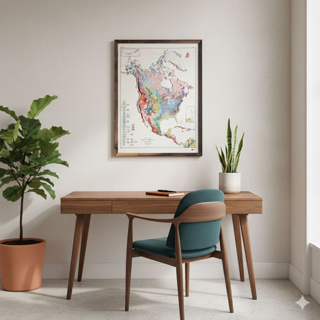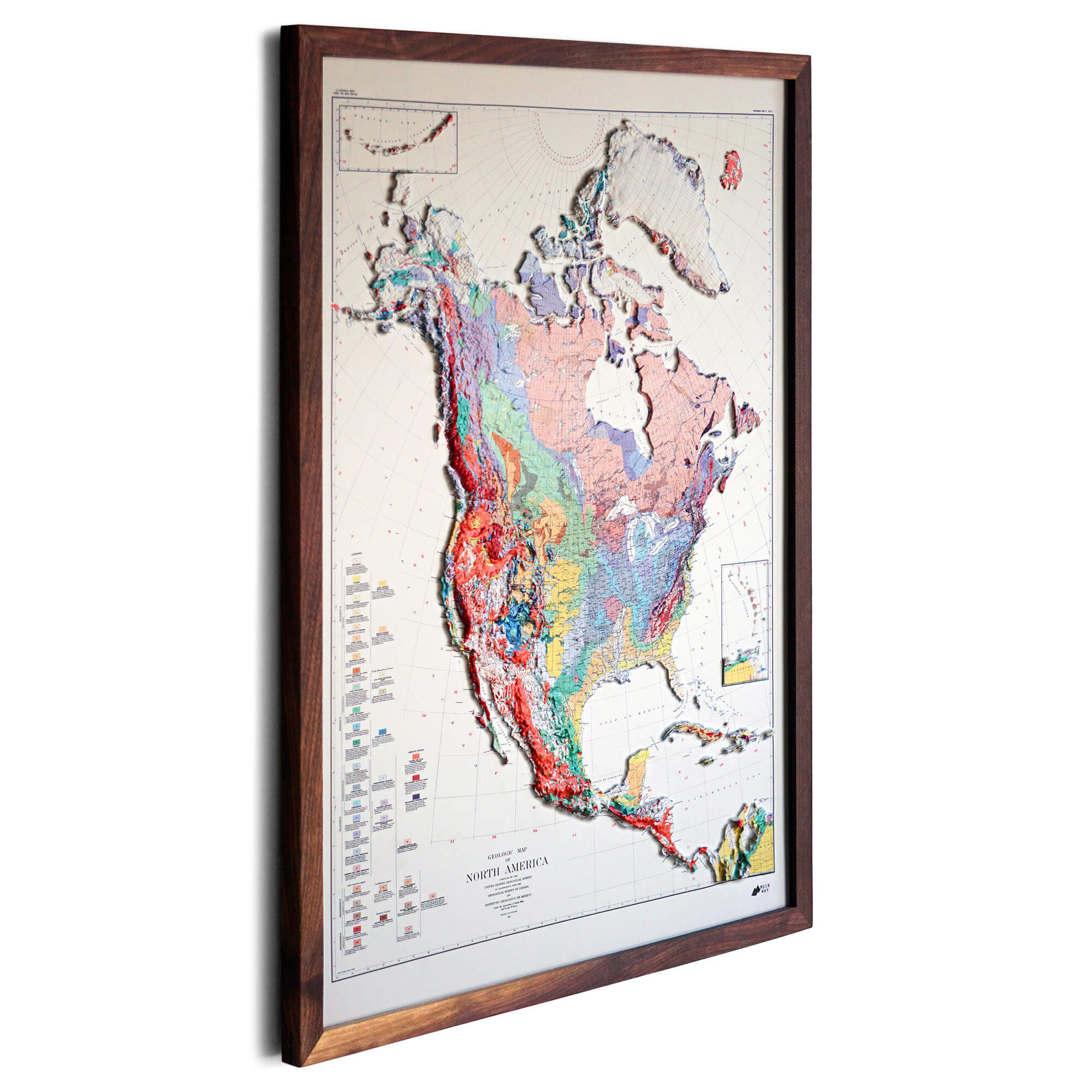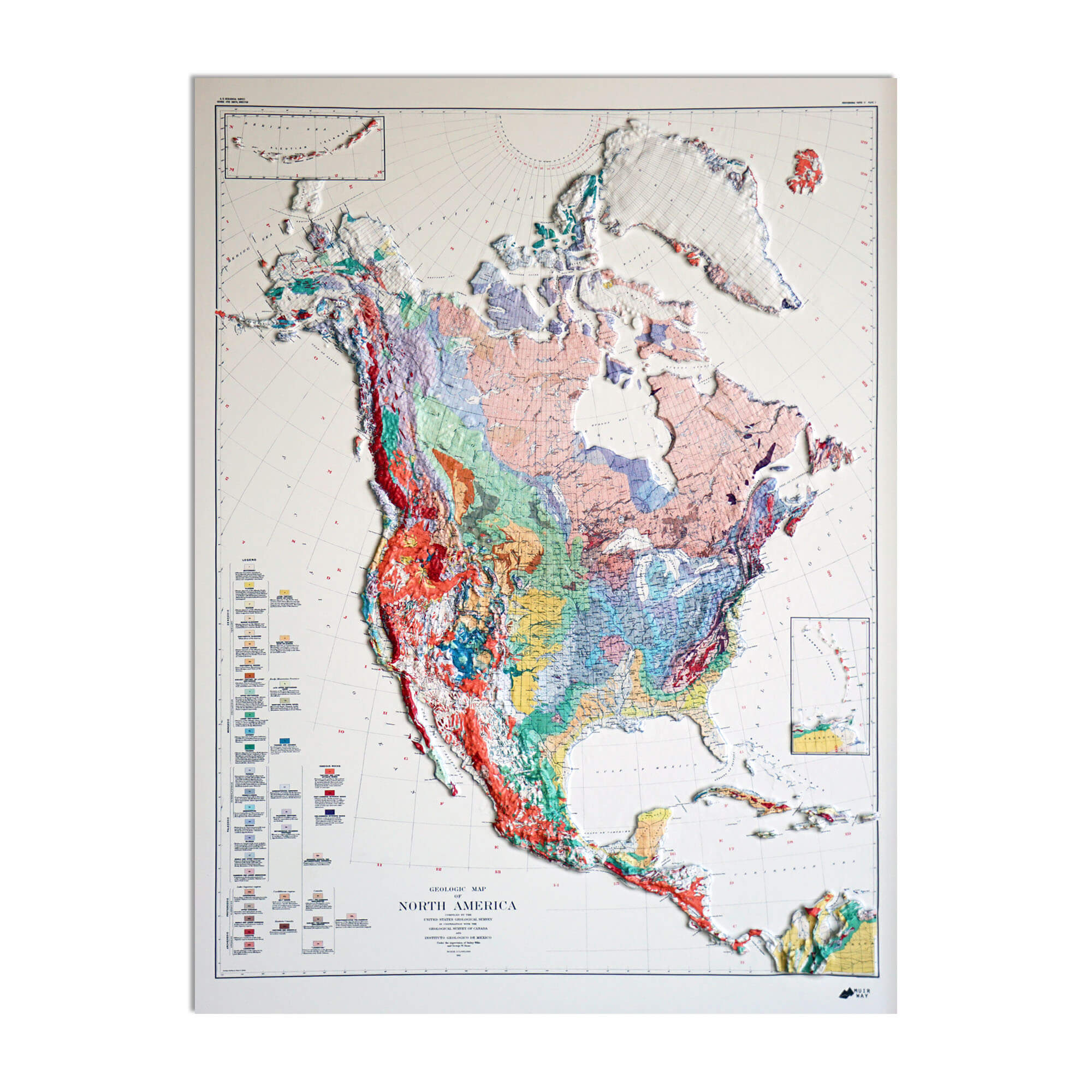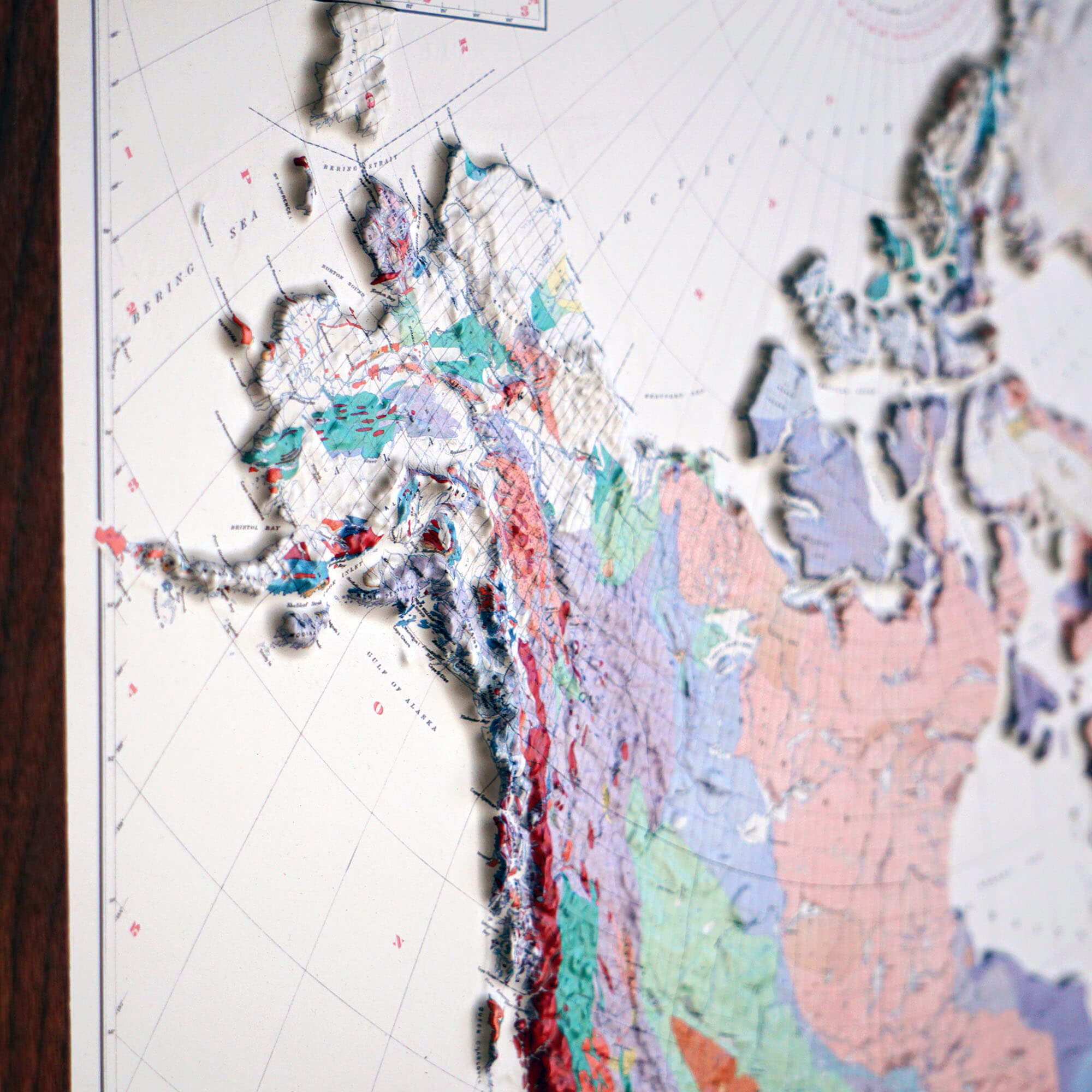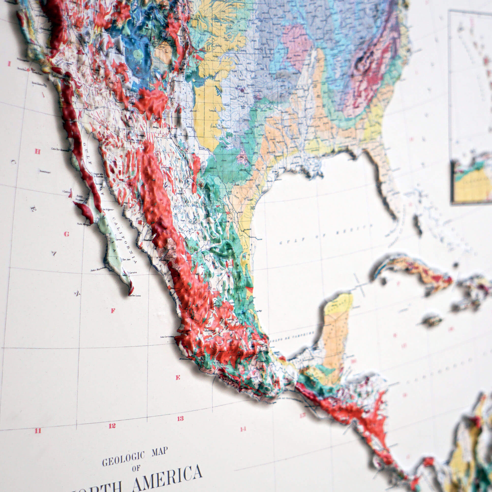 Explore the terrain of North America with this stunning 3D Raised Relief transformed from a flat 1911 geological map. This 3D version of the map is an original creation by Muir Way.