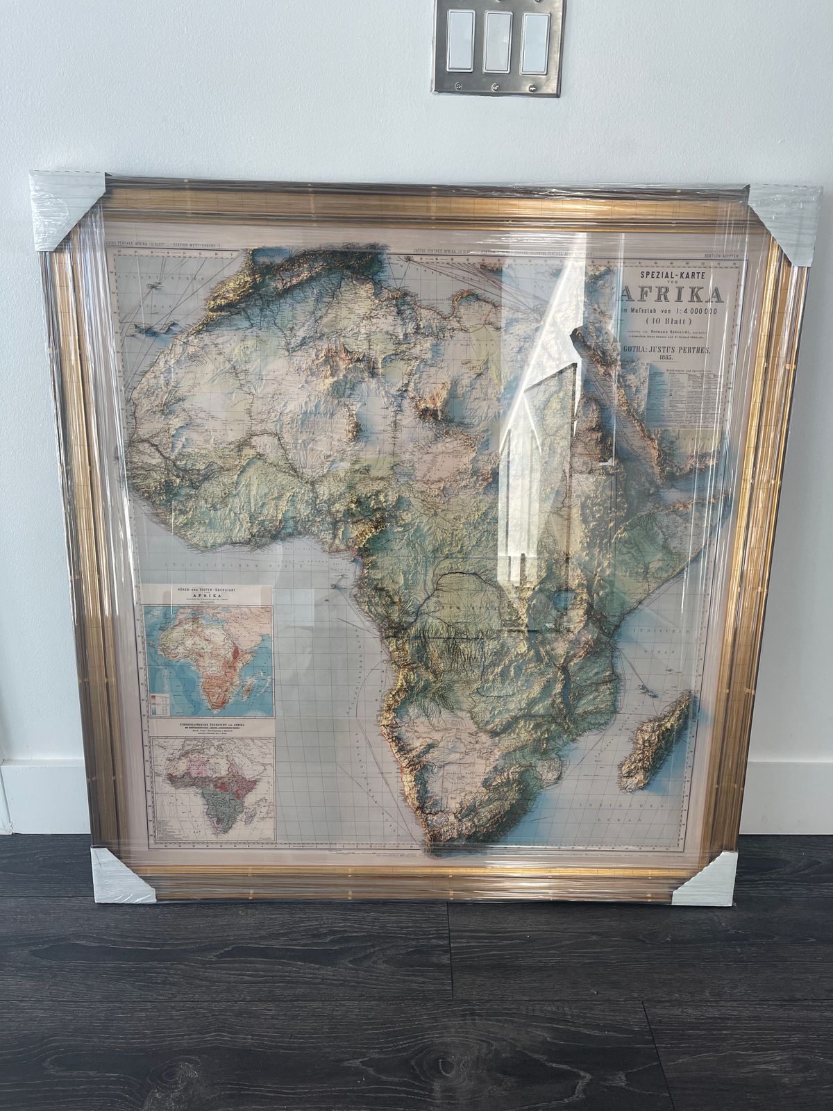 We created this map with the illusion of 3D by applying Digital Elevation Data and meticulously adding shaded relief to the landscape of the original 1885 Africa Geological map. The shading is printed on the paper and not a result of the map protruding from the surface.