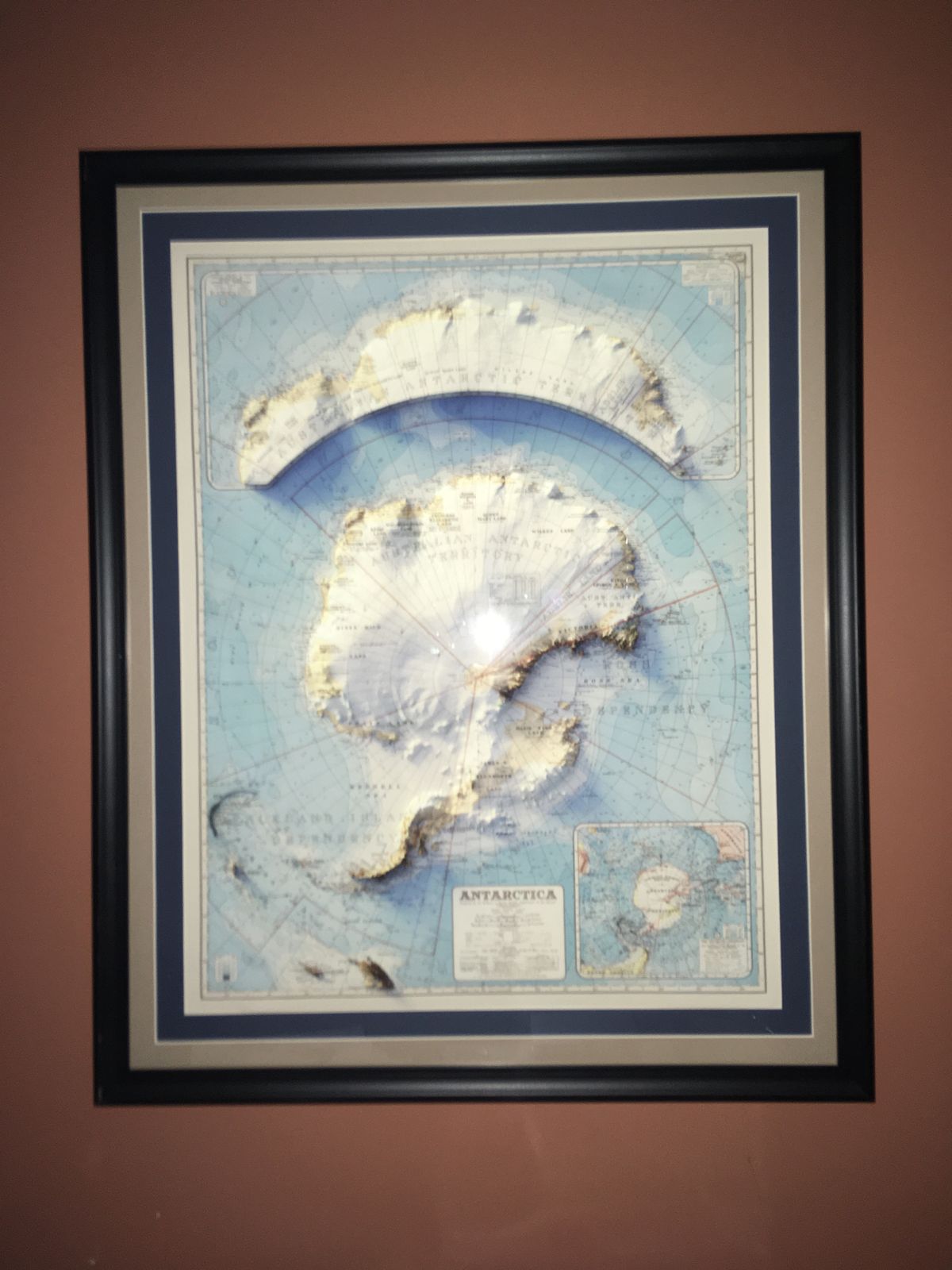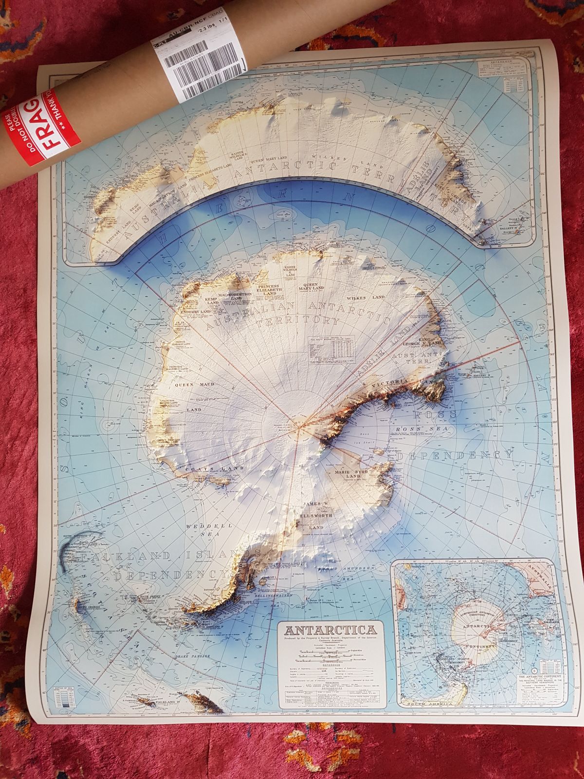 We created this map with the illusion of 3D by applying Digital Elevation Data and meticulously adding shaded relief to the landscape of the original 1939 Antarctica map. The shading is printed on the paper and not a result of the map protruding from the surface.