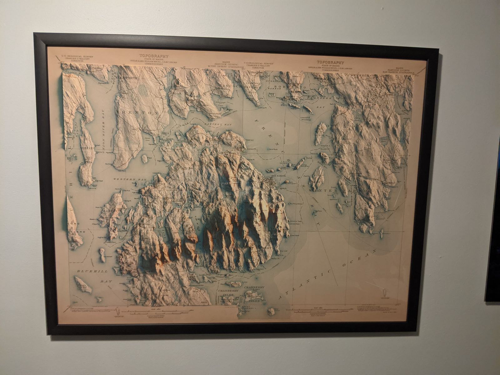 We created this map with the illusion of 3D by applying Digital Elevation Data and meticulously adding shaded relief to the landscape of the original 1904 Acadia map. The shading is printed on the paper and not a result of the map protruding from the surface.