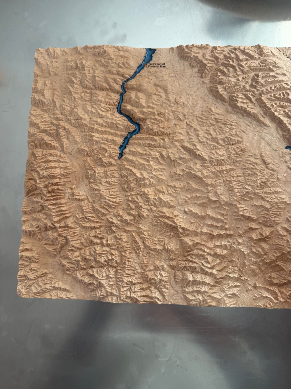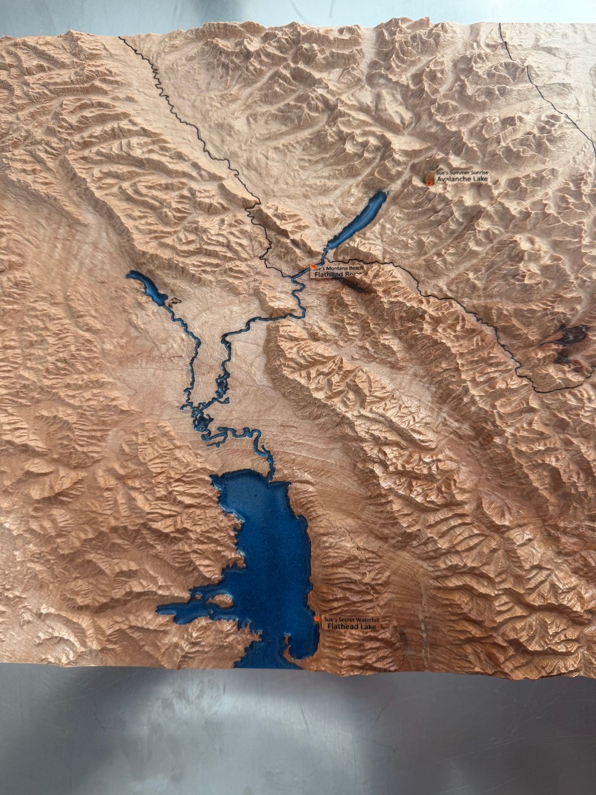 Then I discovered Muir Way maps. When I contacted them and told them my story, they immediately jumped on board to create a 3D wooden map from a beautiful solid piece of maple on which all of the places where ashes were placed could be marked and labeled however I chose. Zac, the craftsman and artist who created the map, and I communicated several times by phone and email during the process, ensuring that the finished product was exactly what I had envisioned.