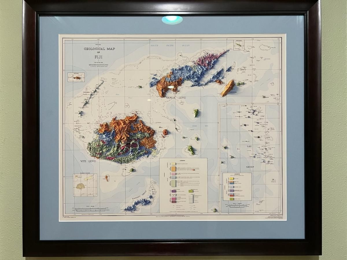 We created this map with the illusion of 3D by applying Digital Elevation Data and meticulously adding shaded relief to the landscape of the original 1965 Fiji Geological map. The shading is printed on the paper and not a result of the map protruding from the surface.