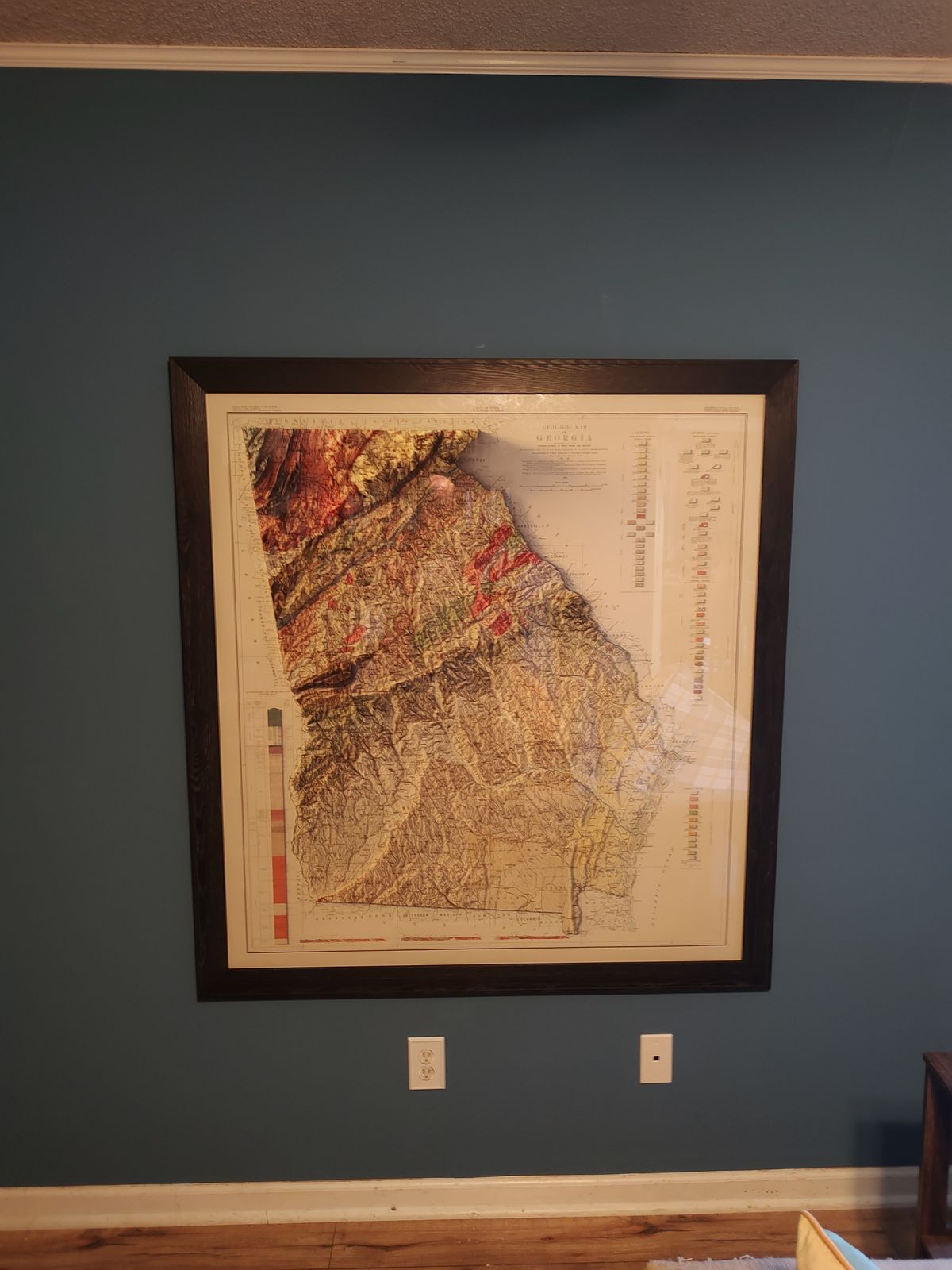 We created this map with the illusion of 3D by applying Digital Elevation Data and meticulously adding shaded relief to the landscape of the original 1939 Georgia Geological map. The shading is printed on the paper and not a result of the map protruding from the surface.
