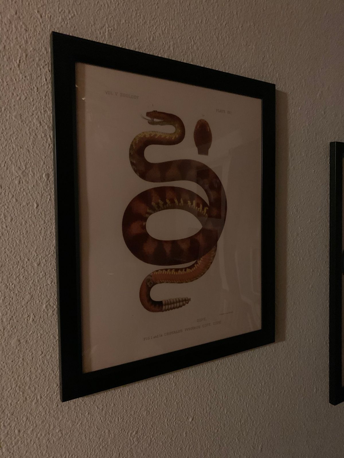 A reproduction print of the Crotalus Pyrrhus, or Southwestern Speckled Rattlesnake, from the "Report upon United States Geographical Surveys, West of the 100th Meridian" by George M. Wheeler. The US Army Corps of Engineers surveyed over 361,000 square miles from 1869 to 1879 in pursuit of creating a detailed topographic map of the West. Wheeler's monumental work was published in 7 volumes from 1875 to 1889. The original lithographic print was prepared as part of the survey and was published in volume 5 of the collection in 1875.