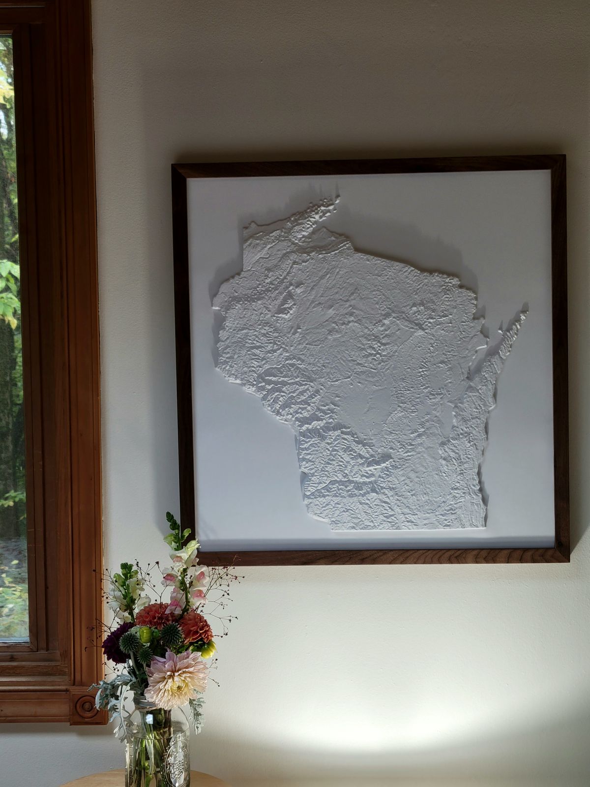A Muir Way original, our 3D Raised Relief Map of Wisconsin shows with intricate detail the topography of the state. Formed by heating highly formable plastic over a 3D mold, you can see and feel the terrain of the state from the Apostle Islands in the north to the Driftless Area in the west. Using cutting-edge techniques, we believe our 3D plastic raised relief maps are by far, the highest quality and most finely detailed of their kind ever created.
