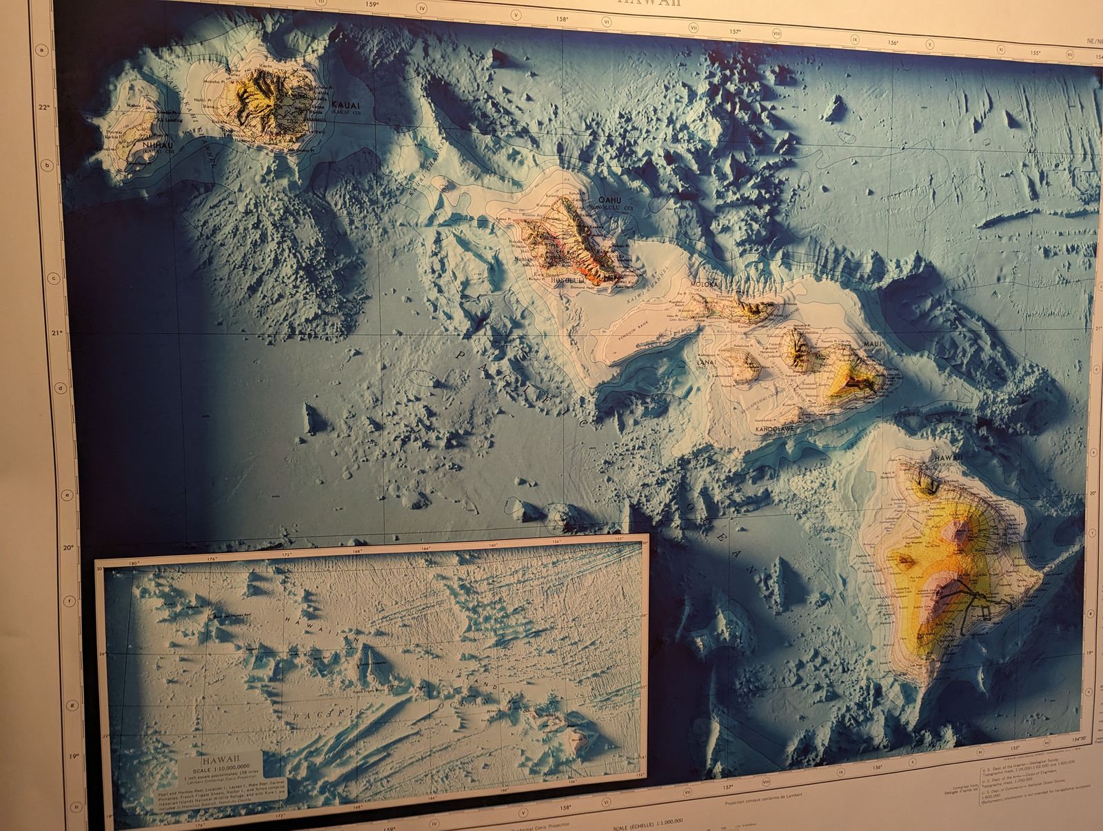 We created this map with the illusion of 3D by applying Digital Elevation Data and meticulously adding shaded relief to the landscape of the original 1961 Maui map. The shading is printed on the paper and not a result of the map protruding from the surface.