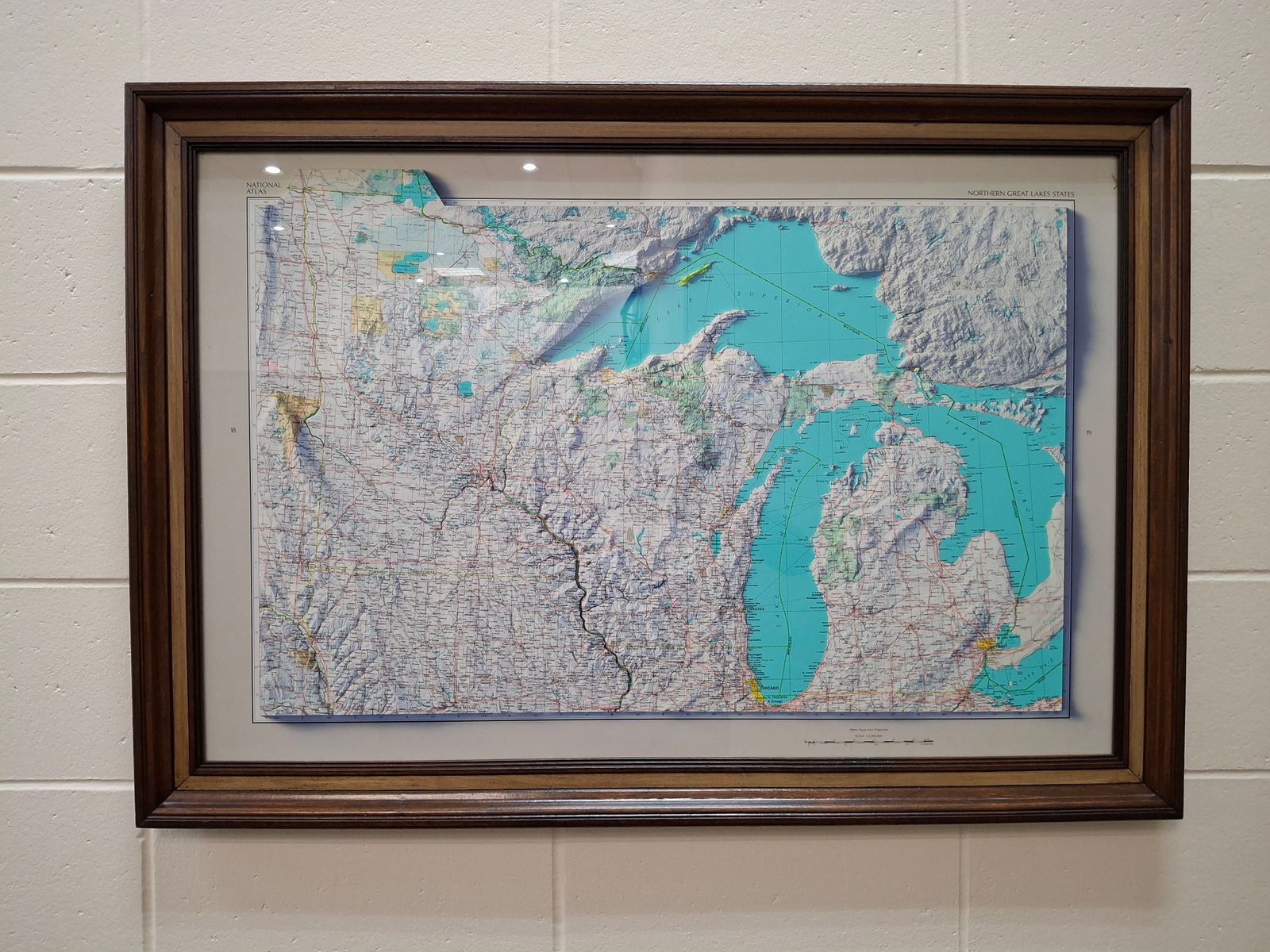 We created this map with the illusion of 3D by applying Digital Elevation Data and meticulously adding shaded relief to the landscape of the original. The map of the Northern Great Lakes States was first published as part of the 1970 United States National Atlas created by the USGS and includes political boundaries, cities, railways, roads, ferry lines, Indian reservations, national forests and parks, mountains, mesas, valleys, deserts, bodies of water, drainage, coastlines and islands. The shading that we added is printed on the paper and not a result of the map protruding from the surface.
