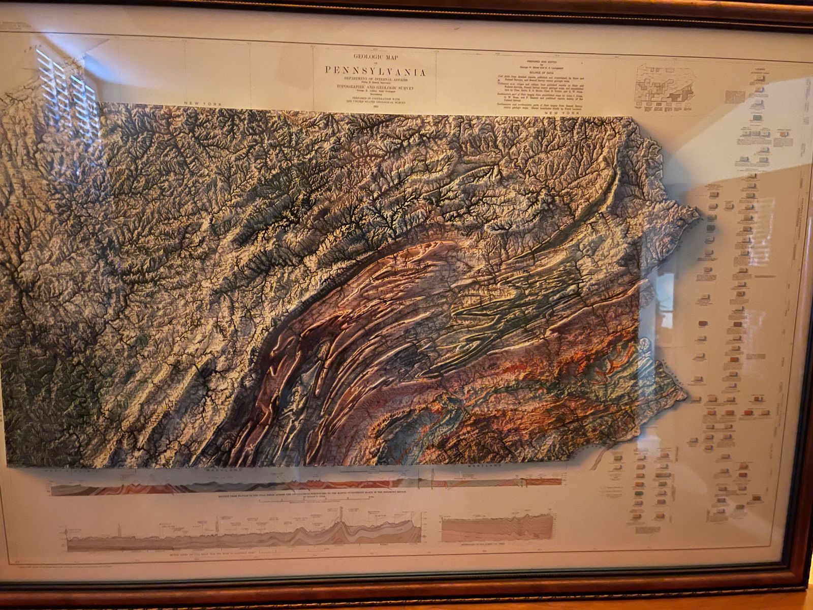 We created this map with the illusion of 3D by applying Digital Elevation Data and meticulously adding shaded relief to the landscape of the original 1931 Pennsylvania map. The shading is printed on the paper and not a result of the map protruding from the surface.