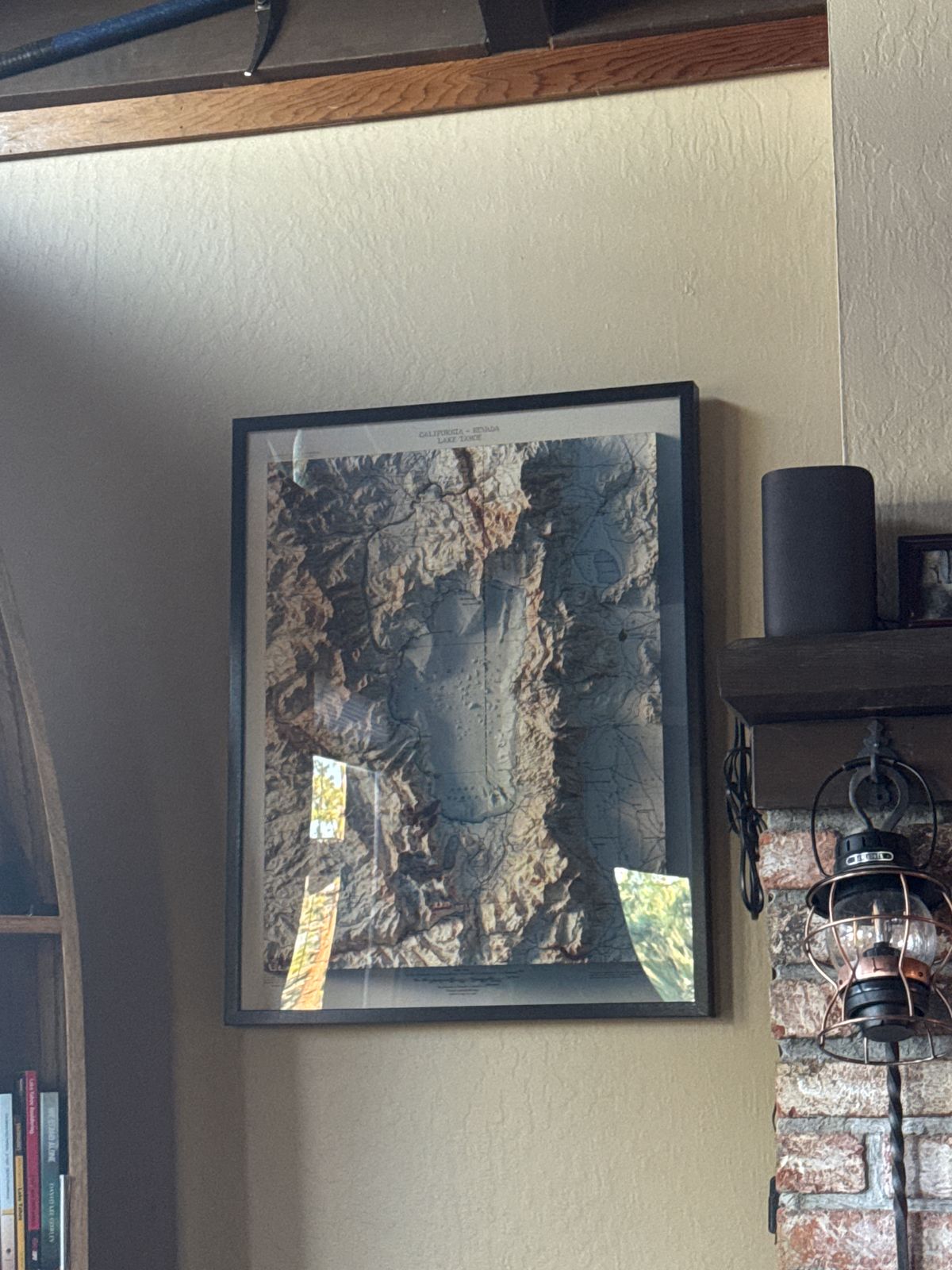 We created this map by compositing four separate quadrant maps from the late 1800's to make a single map of the Lake Tahoe area. Then we used Elevation Data to add shading which creates the illusion of 3D. The shading is printed on the paper and not a result of the map protruding from the surface.
